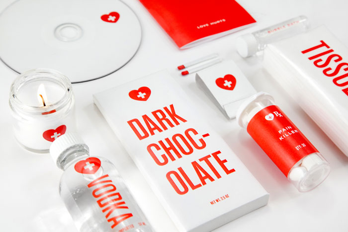 一個破碎的心的急救包。最初,我知道我不想做一個悲傷的工具,想用幽默感來接近這個產品。受傷的愛包含了所有的必需品,